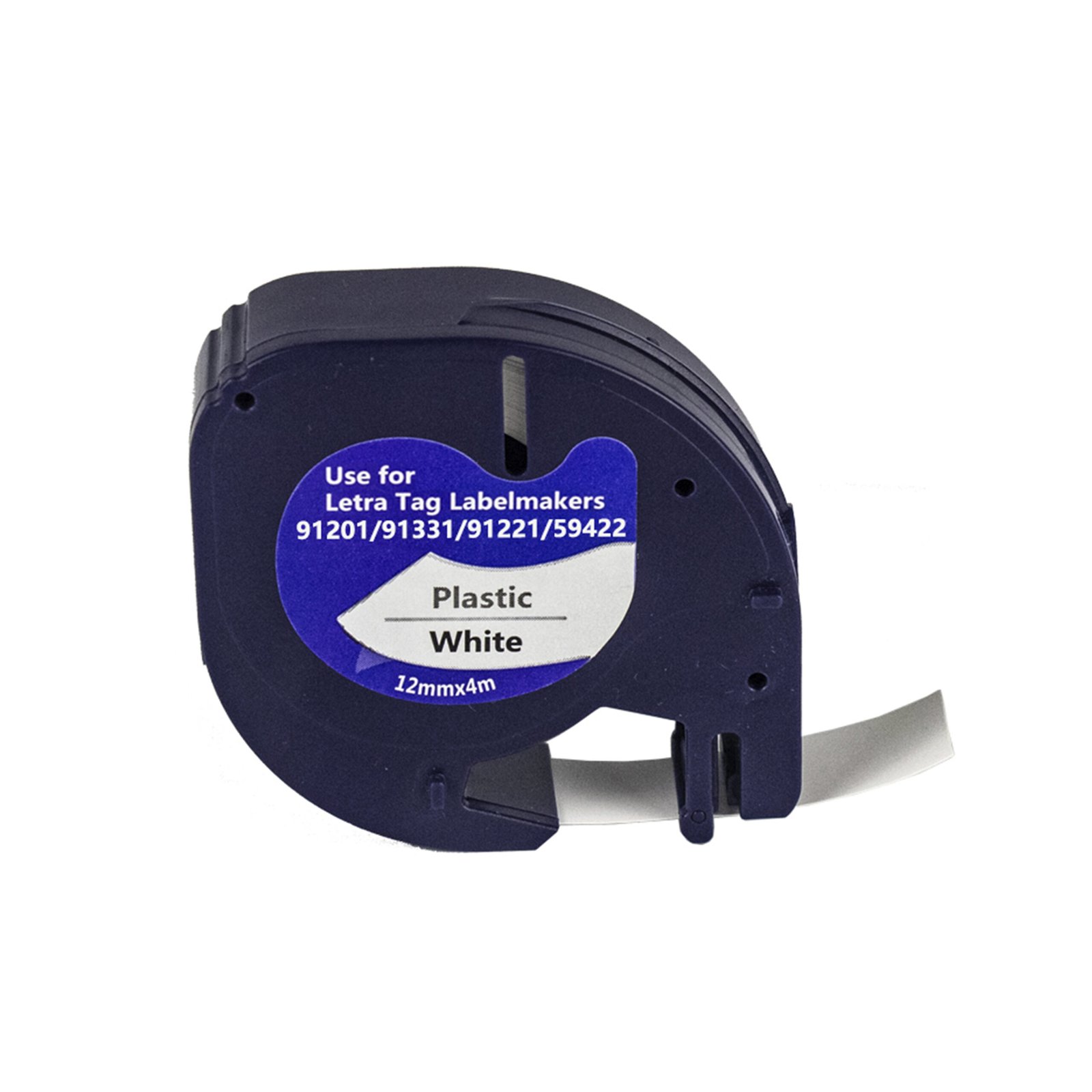 The Compatible Dymo LetraTag 91201 (S0721610) label tape is a 12 mm x 4 m plastic tape cassette designed for use with Dymo LetraTag label makers. This 91201 compatible tape is made from high-strength, tear-resistant polyester (plastic) and features a white background with crisp black thermal text.